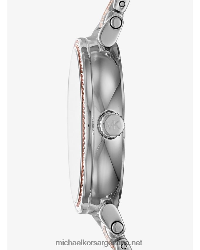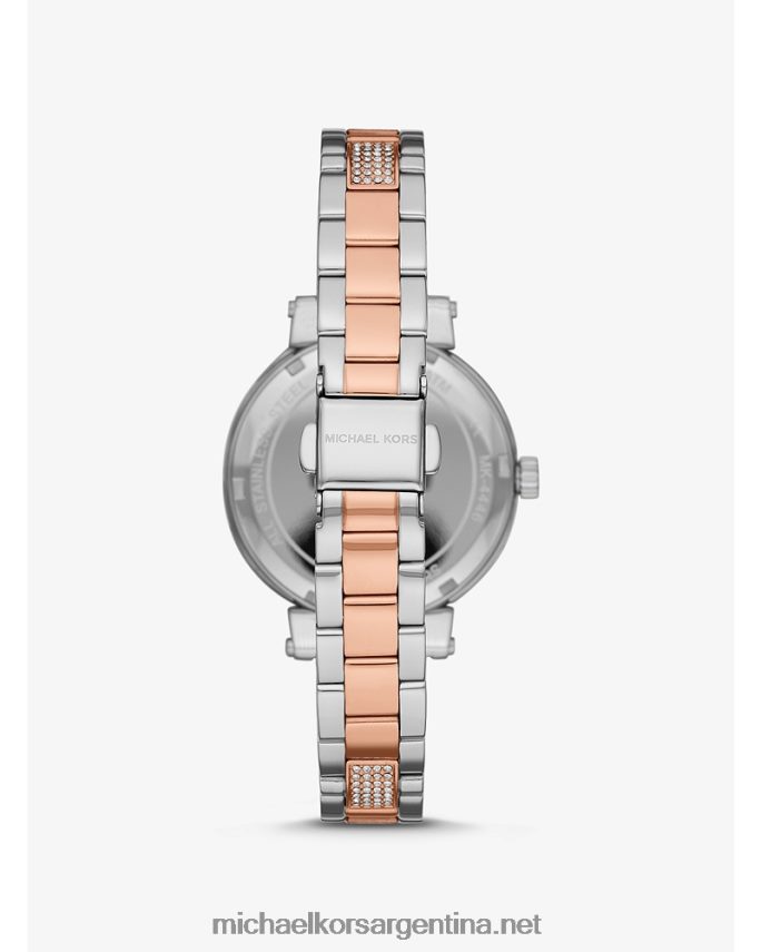 diseñoeleve su aspecto con el sofie, un glamuroso reloj analógico adornado con reluciente cristal pavé. una esfera con el logotipo estampado añade un toque característico, mientras que el acero inoxidable de dos tonos ofrece un acabado lujoso.