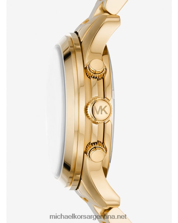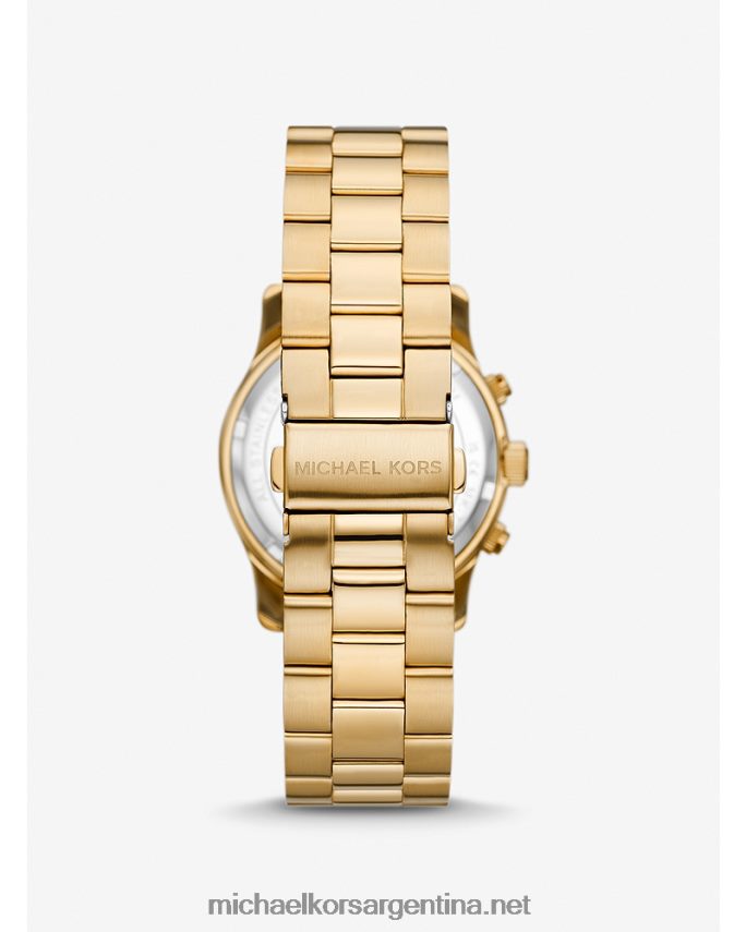 el toque final perfecto para cualquier atuendo, nuestro nuevo reloj de pasarela será el favorito en los años venideros. actualizado con subesferas elevadas, este estilo elegante está fabricado en acero inoxidable dorado con una correa de pulsera pulida y cuenta con detalles de cronógrafo para medir el tiempo con precisión.